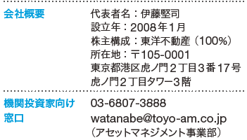 東私募ファンドAMとして、オフィス、レジ、商業施設、物流施設、インダストリアル施設やホテルなど幅広いアセットを運用。基本はコア、コアプラス型といった投資家への安定的な配当を目指している。自らアレンジやソーシングを行うこともあるが、多くは受託型の案件で、ソーシングやアレンジを行うさまざまな企業と共同で資産運用している。またブリッジファンドや投資事業有限組合の管理、サブAMも行っている。